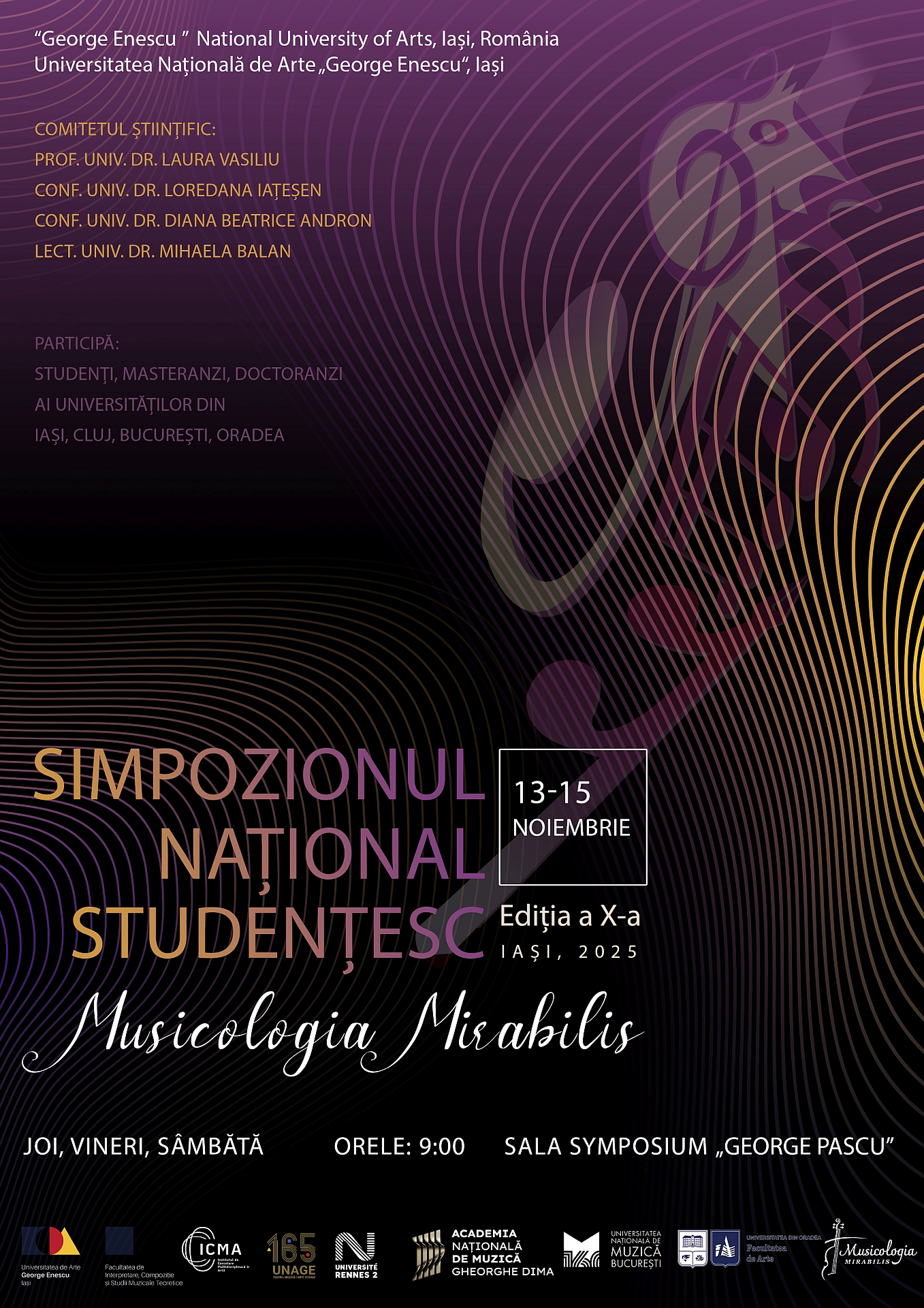 În acest an, cu ocazia organizării celei de-𝐚 𝐗-𝐚 ediții a Simpozionului Studențesc „Musicologia Mirabilis”, va avea loc un eveniment mai amplu, de tip 𝐜𝐨𝐧𝐟𝐞𝐫𝐢𝐧ță 𝐝𝐞 𝐦𝐮𝐳𝐢𝐜𝐨𝐥𝐨𝐠𝐢𝐞 𝐜𝐮 𝐩𝐚𝐫𝐭𝐢𝐜𝐢𝐩𝐚𝐫𝐞 𝐢𝐧𝐭𝐞𝐫𝐧𝐚ț𝐢𝐨𝐧𝐚𝐥ă, care va integra: