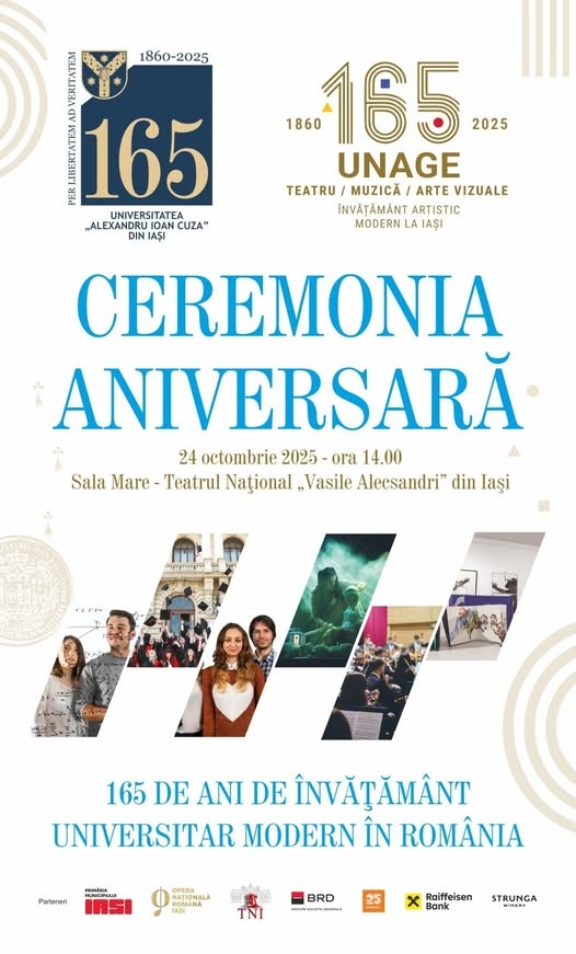 Evenimentul festiv „165 de ani de învățământ universitar modern în România” va avea loc vineri, 24 octombrie 2025, la ora 14.00, în Sala Mare a Teatrului Național „Vasile Alecsandri” din Iași.