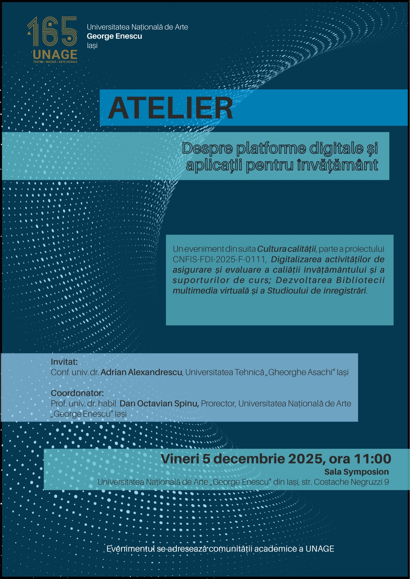 Vă invităm vineri, 5 decembrie 2025, la ora 11, în Sala Symposion – Corpul Artes, la un atelier despre platforme digitale și aplicații pentru învățământ, susținut de invitatul nostru, conf. univ. dr. Adrian Alexandrescu, de la Universitatea Tehnică ”G. Asachi” din Iași.
