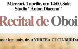 Universitatea Națională de Arte „George Enescu” din Iaşi, organizează Miercuri, 01 aprilie 2026, ora 14.00, în sala Studio Anton Diaconu, un Recital de oboi. Interpretează studenți din cadrul Facultății de [...]