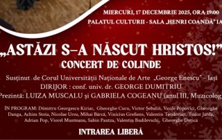 Miercuri, 17 Decembrie 2025, ora 19:00 PALATUL CULTURII – SALA „HENRI COANDĂ” IAȘI ASTĂZI S-A NĂSCUT HRISTOS! CONCERT DE COLINDE Susținut de Corul Universității Naționale de Arte „George Enescu” [...]