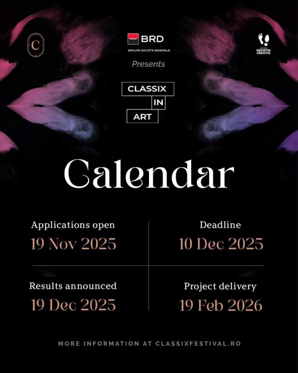 Ne bucurăm să aducem în atenția studenților și absolvenților UNAGE programul creativ Classix in Art, organizat în cadrul Classix Festival 2026. Programul pune la dispoziție 3 granturi, fiecare în valoare de 1.000 EUR, pentru realizarea unor proiecte artistice originale. Apelul se adresează studenților din domeniile artelor vizuale, muzica, și artele spectacolului. Propunerile selectate vor fi finanțate și prezentate public în timpul festivalului, în dialog cu tema ediției și cu spațiul urban.