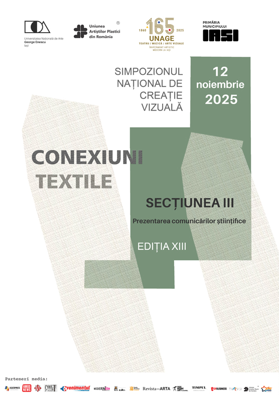Specializarea Arte Textile – Design Textil din cadrul Facultății de Arte Vizuale și Design Iași împreună cu Uniunea Artiștilor Plastici din România Filiala Iași vă invită la SIMPOZIONUL NAȚIONAL DE CREAȚIE VIZUALĂ „CONEXIUNI TEXTILE”- ediția a XIII-a.