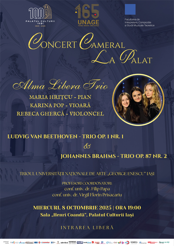 Concertul Cameral la Palat din data de 8 octombrie 2025, găzduit în sala Henri Coandă, începând cu ora 19.00, aduce în lumina reflectoarelor concertul susținut de Trioul Universității Naționale de Arte „George Enescu” din Iași, Facultatea de Interpretare, Compoziție și Studii Muzicale Teoretice, specializarea Interpretare Muzicală – Instrumente, aflat sub îndrumarea conf. univ. dr. Filip Papa și conf. univ. dr. Virgil Florin Prisacariu.