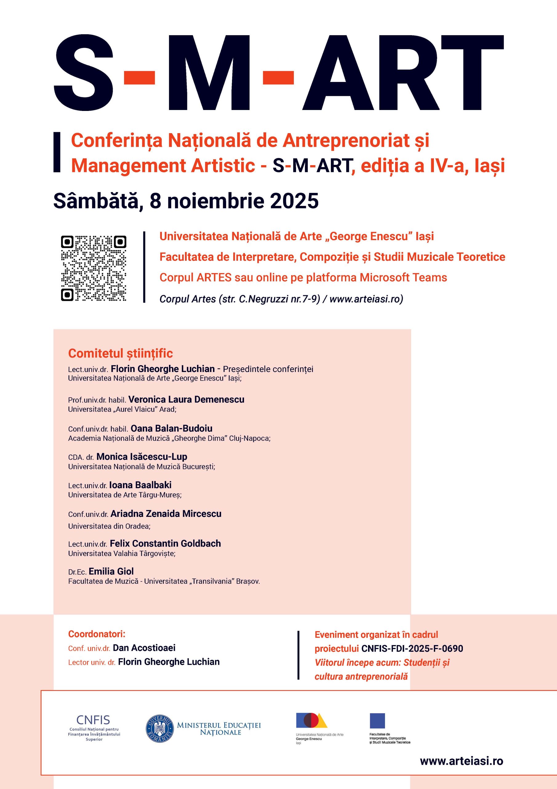 Conferința Națională de Antreprenoriat și Management Artistic – S-M-ART 2025 va fi organizată în data de 8 noiembrie la Universitatea Națională de Arte „George Enescu” din Iași, ca parte dintr-o serie de activități adresate studenților din universitățile cu programe de studii în domeniul Muzică din România interesați să își dezvolte cariera și să întâlnească profesioniști din domeniul managementului artistic.
