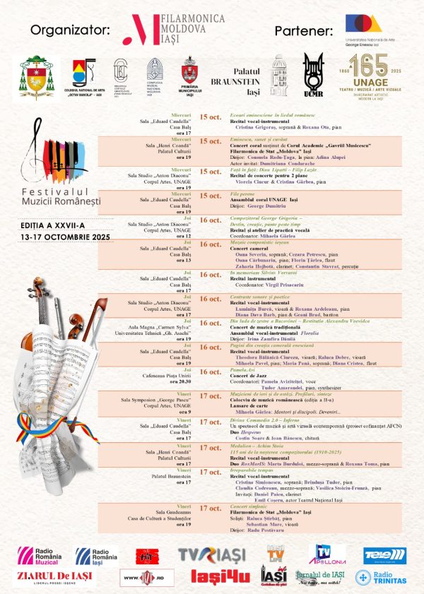 Between October 13 and 17, 2025, the Romanian Music Festival, 27th edition, will take place in Iași, organized by the Moldova State Philharmonic in Iași, in partnership with the George Enescu National University of Arts and the Union of Composers and Musicologists of Romania.