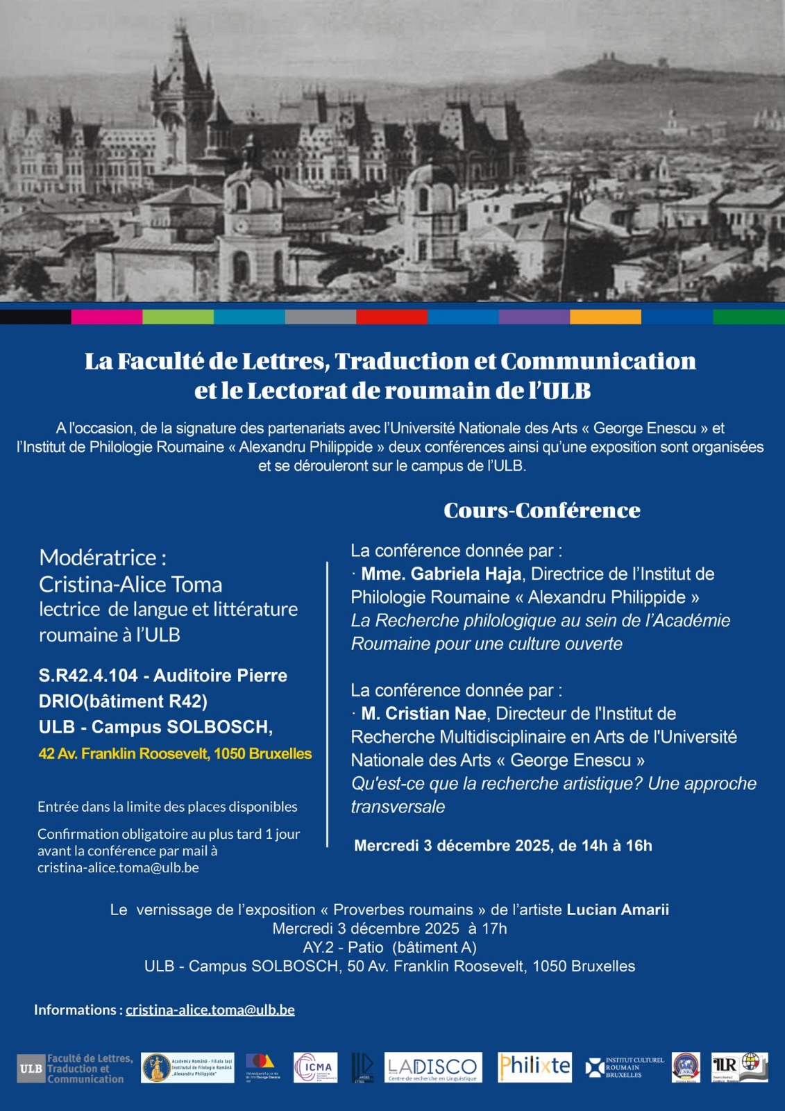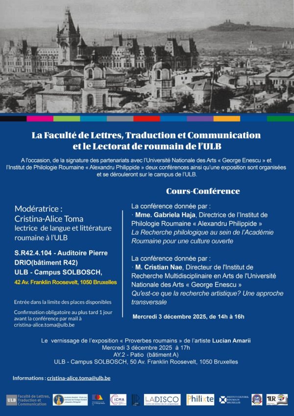 Pentru a marca semnarea parteneriatului dintre Universitatea Națională de Arte „George Enescu” Iași (UNAGE) și Institutul de Filologie Română „Alexandru Philippide” (IFRI) sunt organizate două conferințe și o expoziție, care vor avea loc în campusul ULB (Université libre de Bruxelles), Miercuri, 3 decembrie 2025, orele 14.00-16.00.