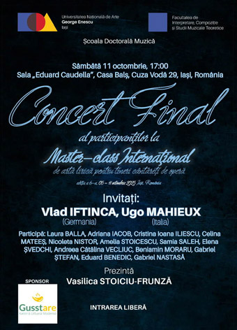 Concertul este susținut de studenți, absolvenți și masteranzi în domeniul artei lirice, sub îndrumarea conf. univ. dr. Vasilica Stoiciu-Frunză și îi are ca invitați pe Vlad Iftinca (Germania) și Ugo Mahieux (Italia).