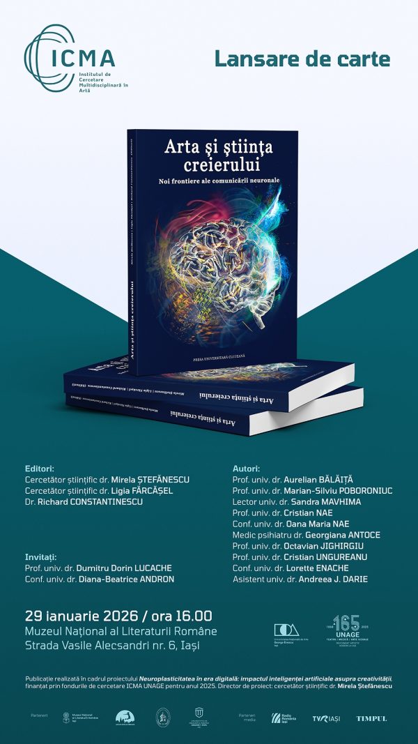 Institutul de Cercetare Multidisciplinară în Artă din cadrul Universității Naționale de Arte „George Enescu” din Iași vă invită la lansarea de carte Arta și știința creierului, noi frontiere ale comunicării neuronale, în data de 29 ianuarie 2026, ora 16.00 la Sala de Conferințe de la Casa Muzeelor (Str. Vasile Alecsandri nr. 6).