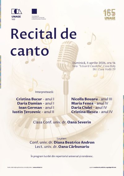 Facultatea de Interpretare, Compoziție și Studii Muzicale Teoretice vă invită la un Recital de canto, Duminică, 05 aprilie 2026, ora 14.00, în Casa Balș, sala „Eduard Caudella”.