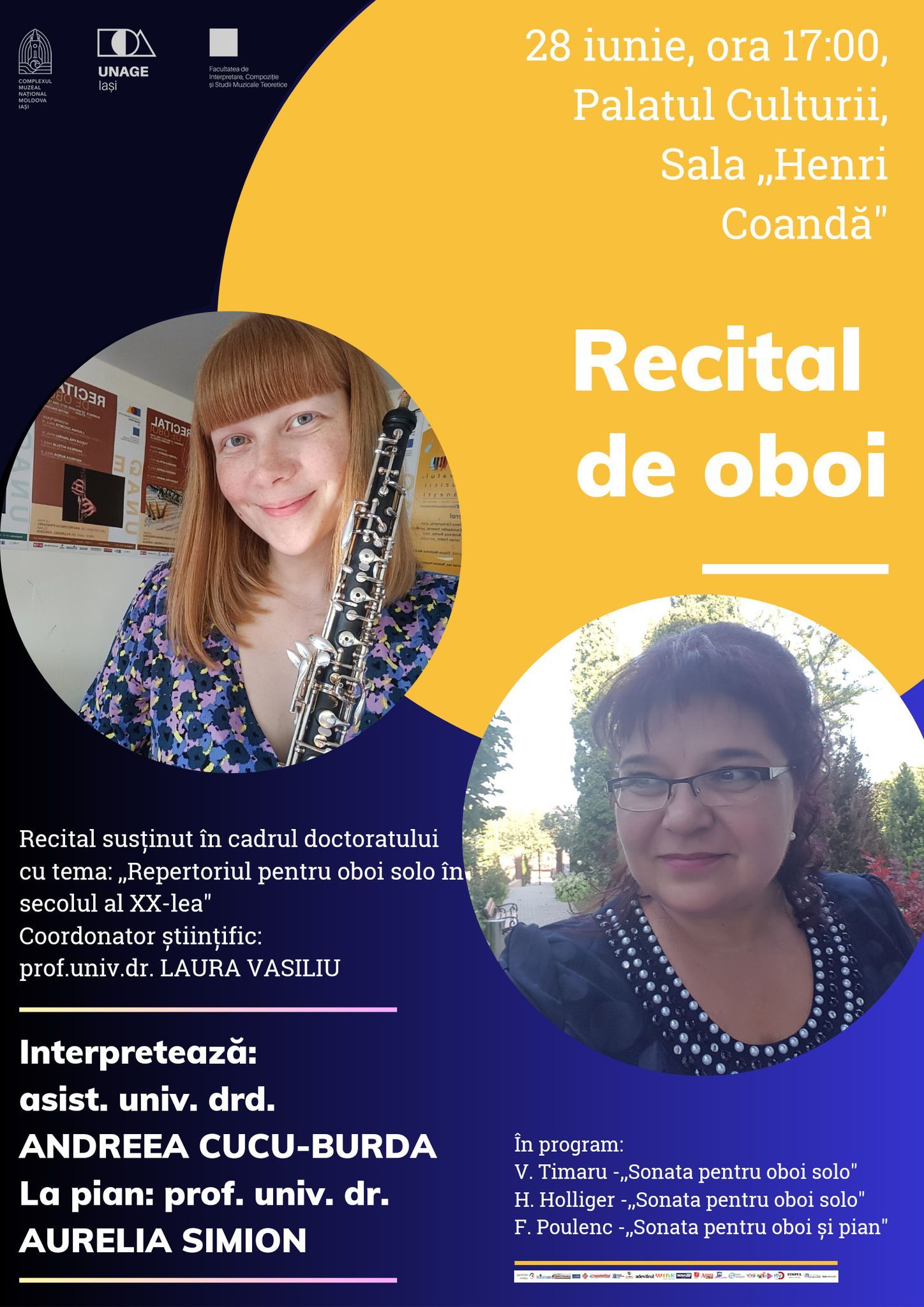 Complexul Muzeal Național „Moldova” Iași, în colaborare cu Universitatea Națională de Arte „George Enescu” Iași, invită publicul miercuri, 28 iunie 2023, ora 17.00, în Sala „Henri Coandă” a Palatului Culturii, la recitalul de oboi susținut de drd. Andreea Cucu-Burda, alături de prof. univ. dr. Aurelia Simion la pian. Evenimentul va avea loc în cadrul doctoratului cu tema Repertoriul pentru oboi solo în secolul al XX-lea.
