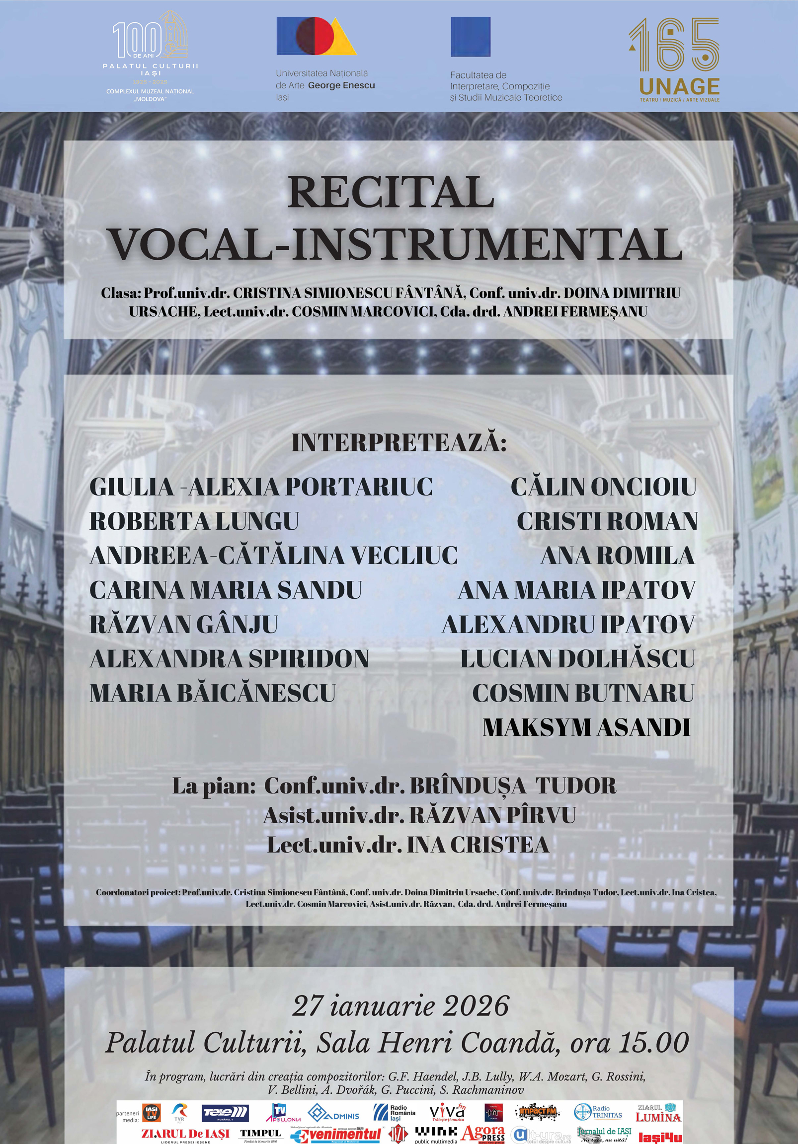Universitatea Națională de Arte „George Enescu” Iaşi în parteneriat cu Complexul Muzeal Național Moldova din Iași, organizeaza Marți, 27 ianuarie 2026, ora 15.00, in sala Henri Coandă, un recital vocal-instrumental, susținut de studenții claselor Prof. univ. dr. Cristina Simionescu Fântână, Conf. univ. dr. Doina Dimitriu Ursache, Lector univ. dr. Cosmin Marcovici, Cda. drd. Andrei Fermeșanu.