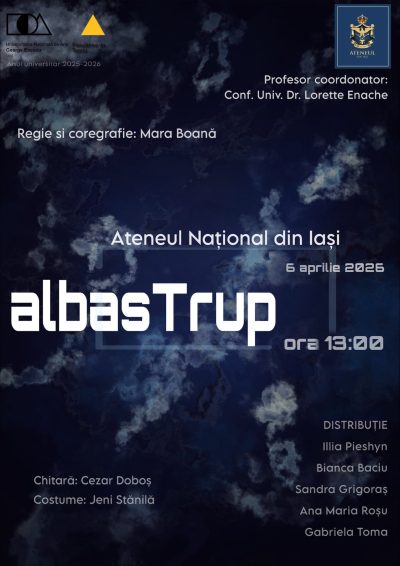 Luni, 6 aprilie 2026, ora 13.00, la Ateneul Național din Iași, se va desfășura Spectacolul de licență albasTrup, coordonat de Conf. univ. dr. Lorette Enache.