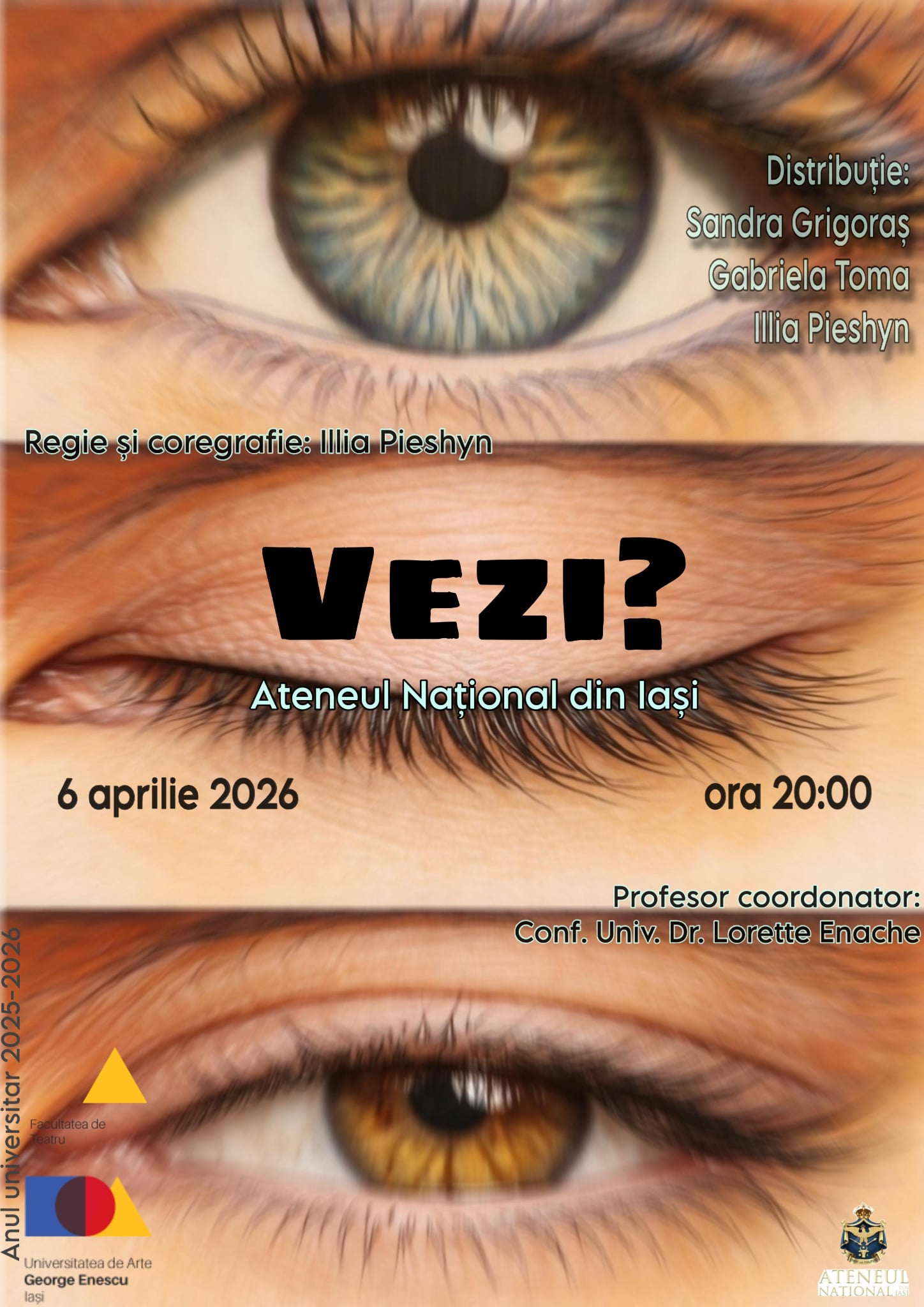 Luni, 6 aprilie 2026, ora 20.00, la Ateneul Național din Iași, se va desfășura Spectacolul de licență „Vezi?”, coordonat de Conf. univ. dr. Lorette Enache.