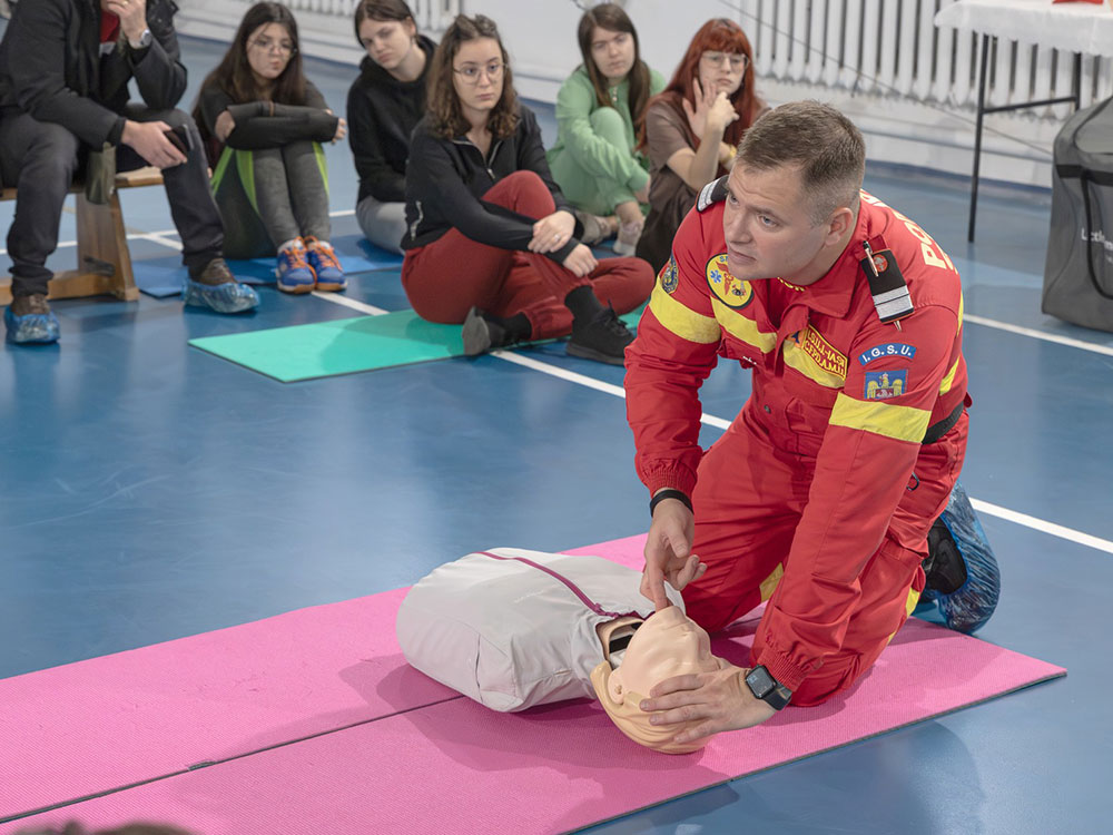 Instruire teoretică și practică privind intervenția în situații de urgență, incluzând evaluarea victimei, apelarea serviciilor de urgență, acordarea suportului vital de bază și intervenții specifice în cazuri de resuscitare cardio-respiratorie, înec alimentar, crize convulsive și alte situații critice.