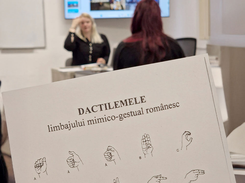 Ateliere introductive de limbajul semnelor române (LSR), dedicate familiarizării participanților cu comunicarea vizual-gestuală și facilitării înțelegerii culturii și comunității persoanelor cu deficiențe de auz.