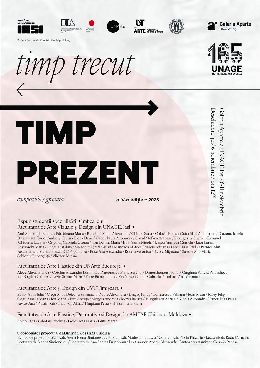 Ediția a IV-a a expoziției TIMP TRECUT-TIMP PREZENT reunește lucrări de grafică semnate de către studenți din patru centre universitare: Universitatea Națională de Arte ”George Enescu” Iași, Universitatea Națională de Arte București, Universitatea de Vest Timișoara – Facultatea de Arte Vizuale și Design și Academia de Muzică, Teatru și Arte Plastice din Chișinău.